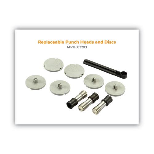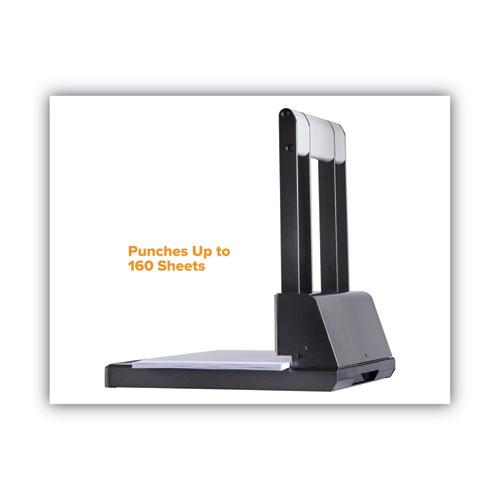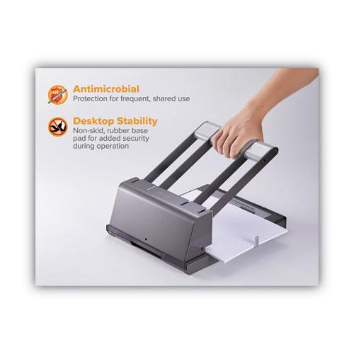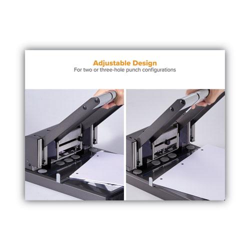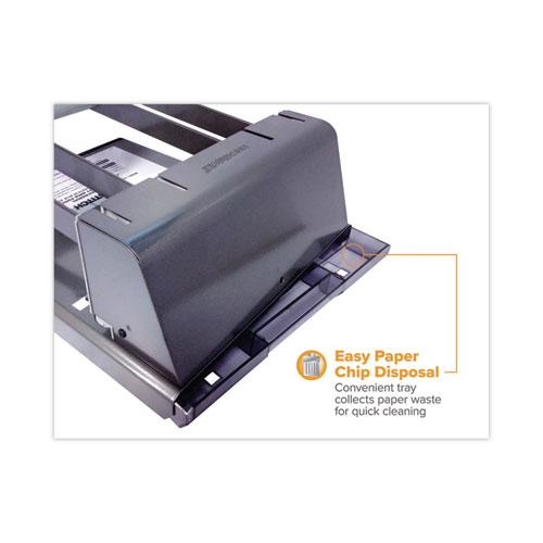 Heavy-duty adjustable punch features extreme punching without the extreme effort. High-leverage handle requires less force to send the precision, hollow steel punch heads through 160 sheets of paper for 9/32" holes. Punch adjusts easily from a two-hole to three-hole configuration and handles different document sizes with an adjustable paper guide. All-metal construction delivers superior performance and remarkable durability. Antimicrobial protected punch includes an easy-to-clean chip tray that catches chip waste for a neater work environment. Handle locks down for easy storage.