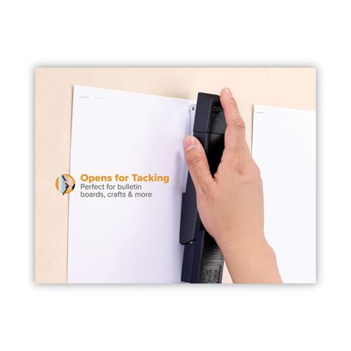 No-Jam Premium Stapler offers dependable performance in a classic design. It opens for bulletin board tacking and crafting. It staples up to 20 sheets of paper at a time. Visual staple-reload alert window reveals low staple supply to avoid an unexpected empty stapler. Adjustable, easy-to-use, dual clinch system provides the option of standard or temporary stapling. Full-strip staple capacity holds one strip of 210 standard staples.