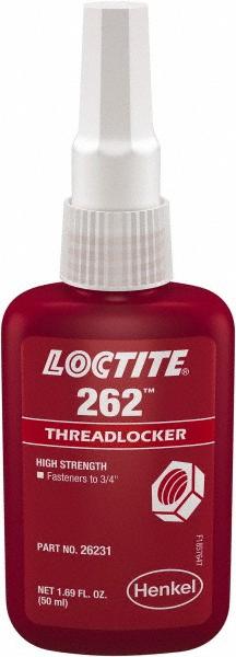 High-Strength Threadlocker, For Material Type Brass, Bronze, Copper, Iron, Manganese, Monel, Nickel, Steel, Threadlocking Strength High, Color Red, Series 262, Container Size 1.69 fl oz, Container Type Bottle, For Maximum Thread Diameter 3/4 in, Working Time 8 min, Breakaway Torque 190 in-lb, Cure Type Anaerobic, Compatible Primer Series Loctite 7649, Threadlocker Properties Oil Tolerant, Standards ASTM D-5363, MIL-S-46163-A, Chemical Base Dimethacrylate, Clean Up Method Solvent, Wire Brush