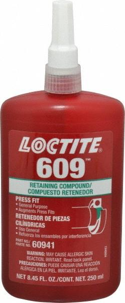 Retaining Compound, For Material Type Steel, Retaining Compounds Properties For Close Fitting Parts, Series 609, Container Size 8.5 fl oz, Container Type Bottle, Maximum Gap Fill Size 0.006 in, Working Time 10 min, Maximum Operating Temperature 300 Degrees F, Minimum Operating Temperature -65 Degrees F, Color Green, Full Cure Time 1 day, Shear Strength 2,290 psi, Standards ASTM D-5363, CFIA Listed, MIL-R-460B, Primer Required Yes, Chemical Base Methacrylate Ester