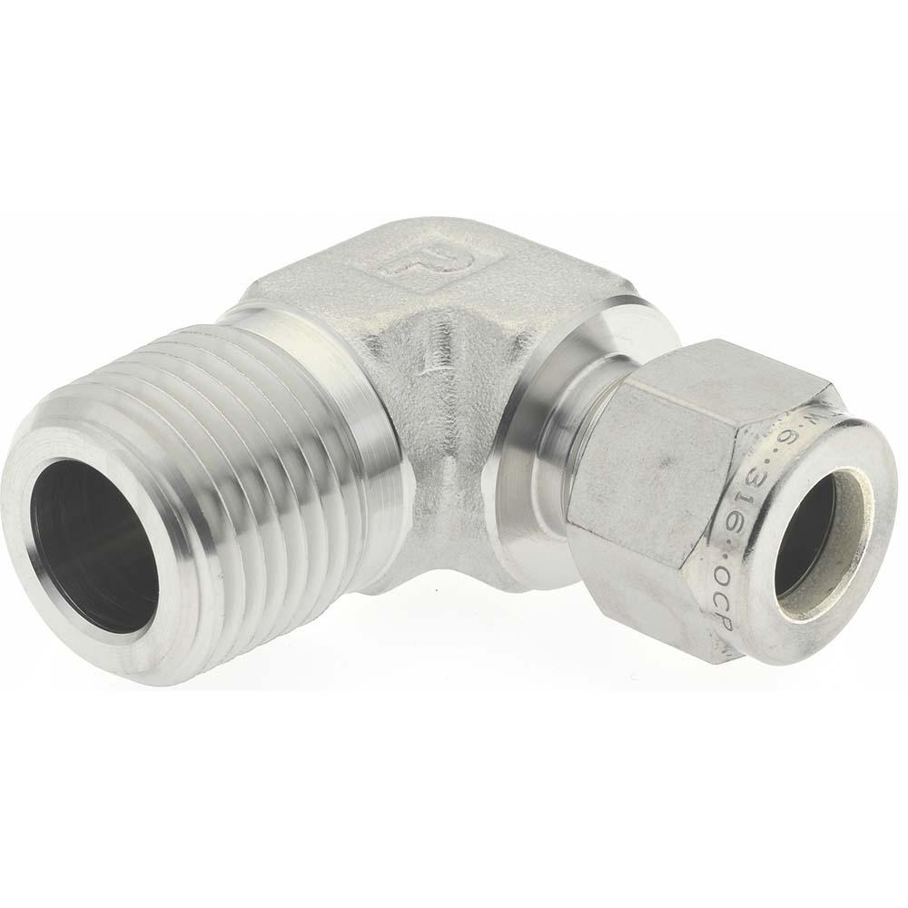 Compression Tube Male Elbow: 1/2-14" Thread, Compression x MNPT 3/8" Tube OD x 1/2-14 NPT Stainless Steel Compression Tube Male Elbow Comp x MNPT Ends, -425 to 1,200°F, 7/8" Hex