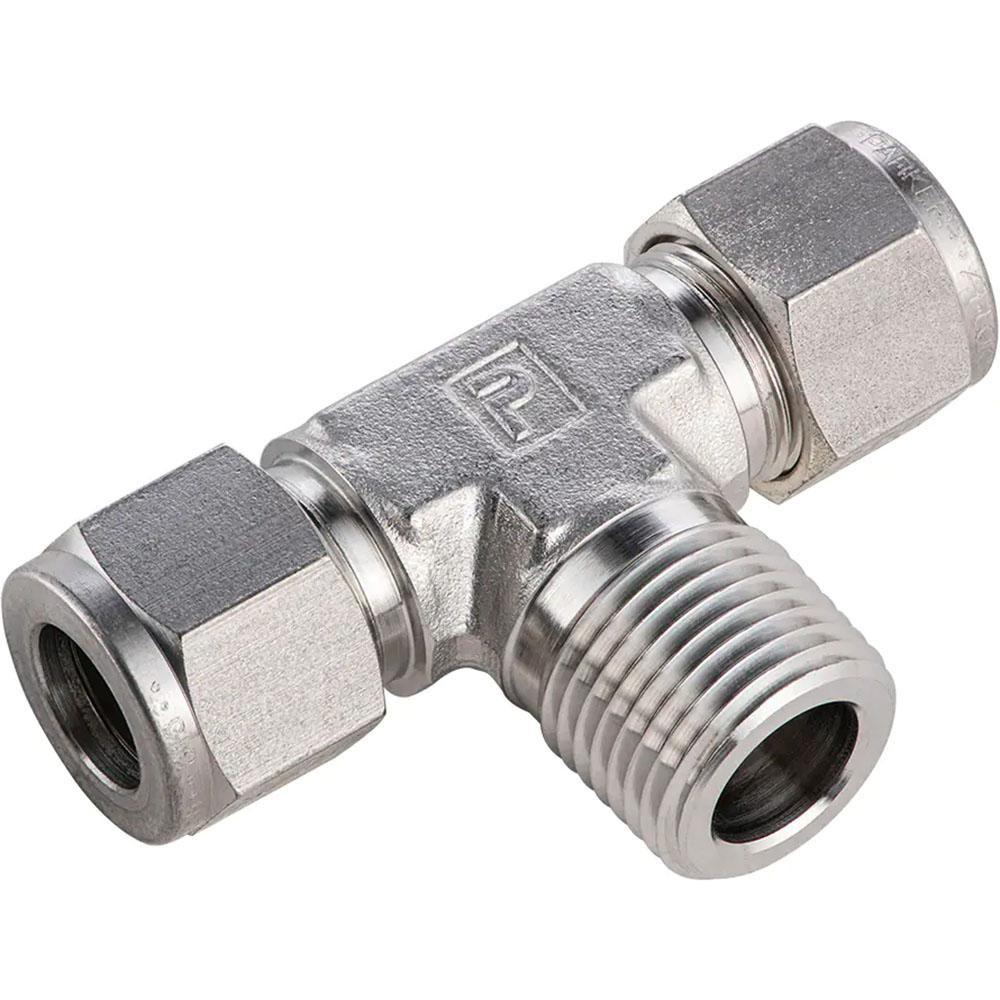 Compression Tube Male Branch Tee: 1/2-14" Thread, Compression x Compression x MNPT Stainless Steel